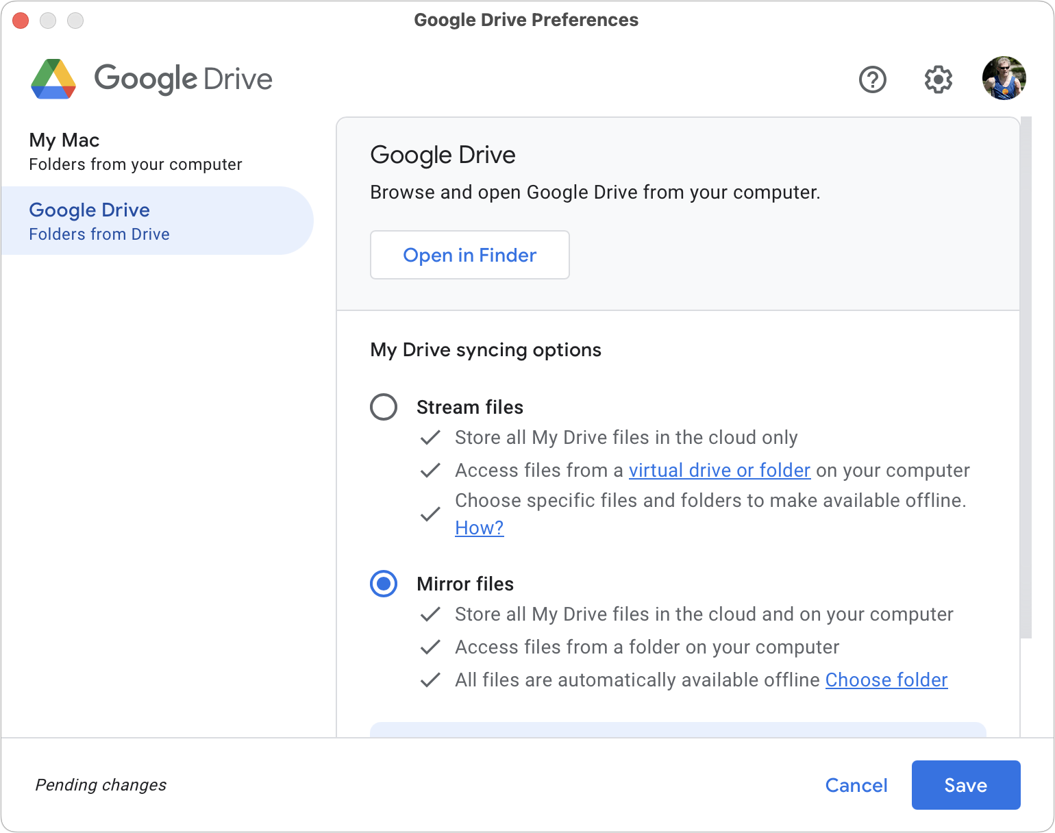Google Drive: Click the Google Drive icon in the menu bar, click the gear menu, choose Preferences, click Google Drive, and select Mirror Files for the My Drive syncing options.