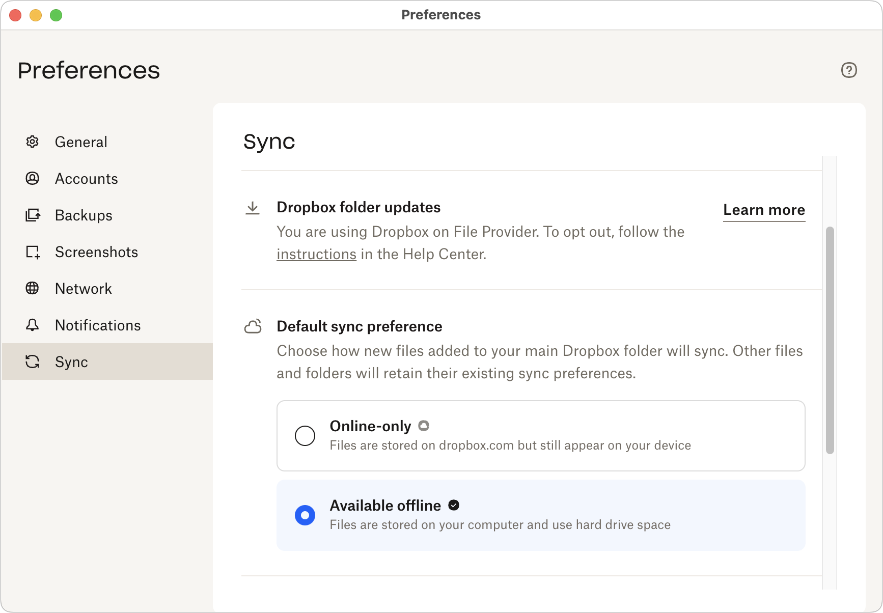 Dropbox: Click the Dropbox icon in the menu bar and then, in Dropbox > Account > Preferences > Sync, choose Available Offline for the Default Sync Preference. Note that this applies only to new files!