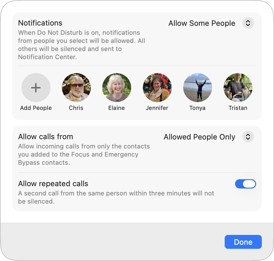 1 - Choose allowed people: Decide whether to allow or silence notifications from specific people. You can also specify whether phone calls from certain groups (Allowed People, Favorites, Contacts, or Contacts groups) can break through.