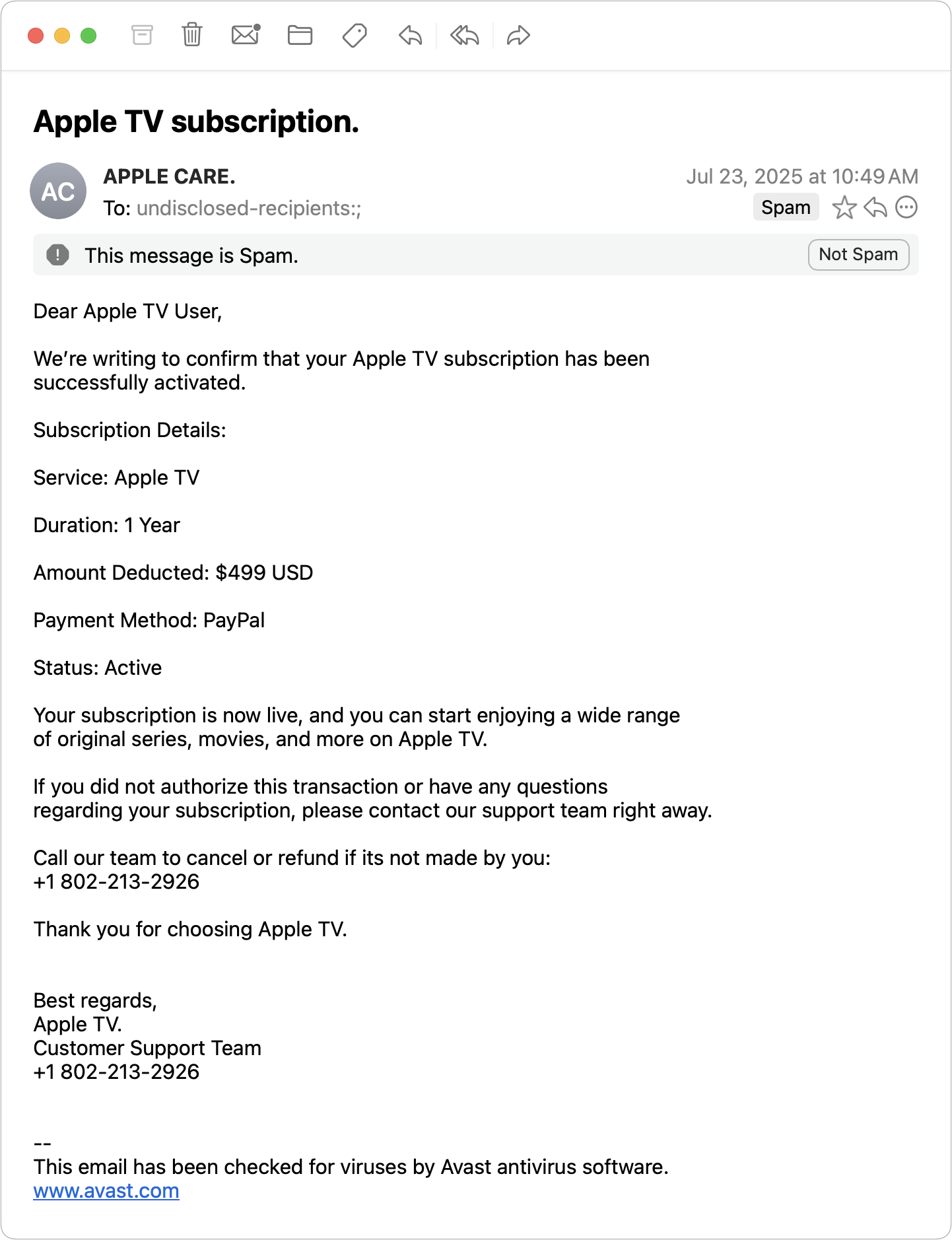 Pop-ups, ads, and emails mimicking Apple: Fake pop-ups, ads, or emails warn of urgent issues, such as the egregiously expensive Apple TV subscription in the example below, and provide numbers to call to rectify the situation. As always, provided phone numbers lead to scammers.