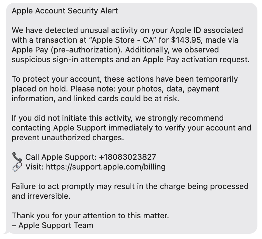 Phishing texts claiming suspicious activity: You receive a text purporting to be from Apple, warning of “unusual activity” or an “unauthorized Apple Pay transaction” and urging you to call an Apple Support number. The message looks official, but the number connects you to a scammer, not Apple.